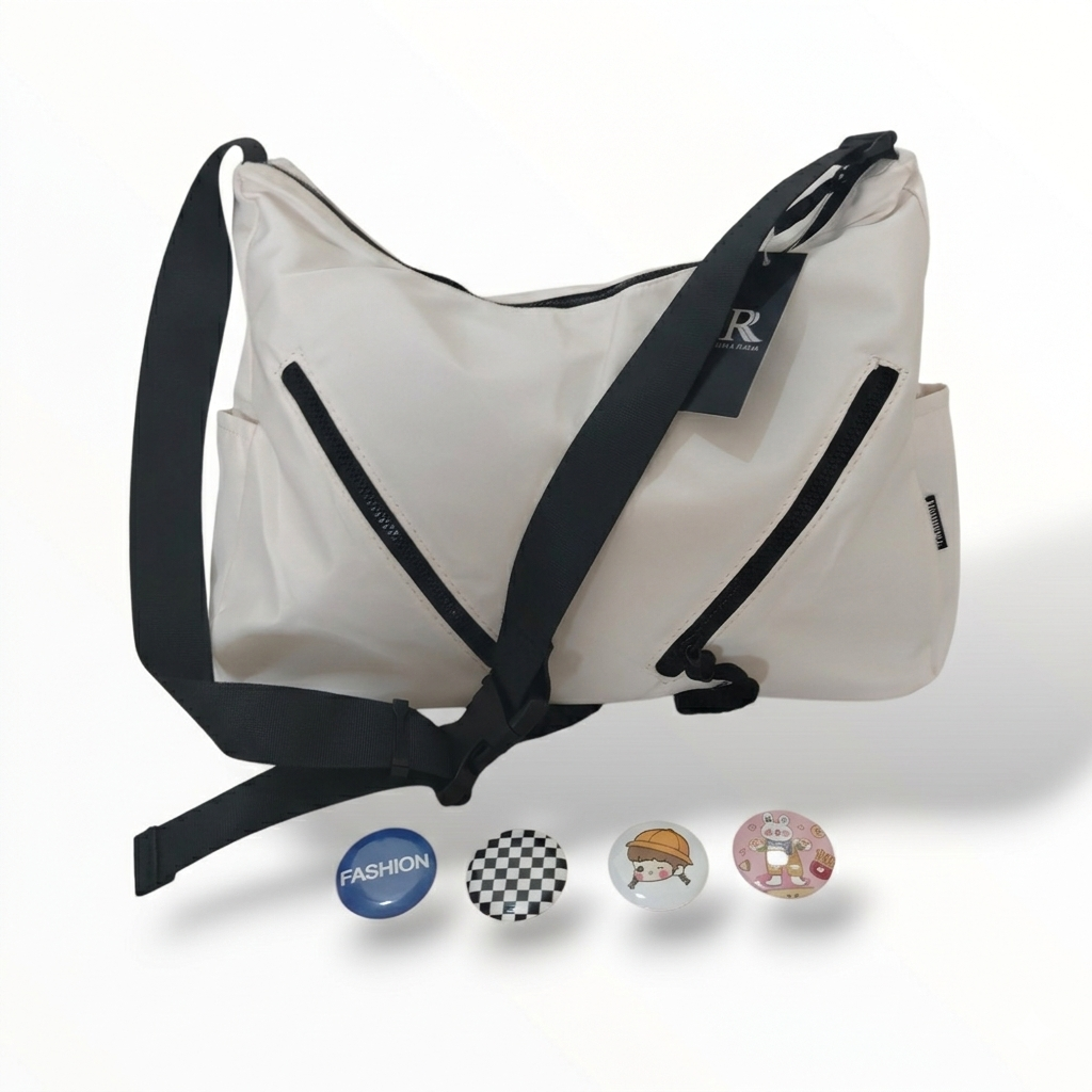 Bolso bandolera estilo hobo en color blanco, ligero y espacioso. Diseño moderno y versátil con correa ajustable negra, cierre principal de cremallera y bolsillos frontales con cremallera para acceso rápido.