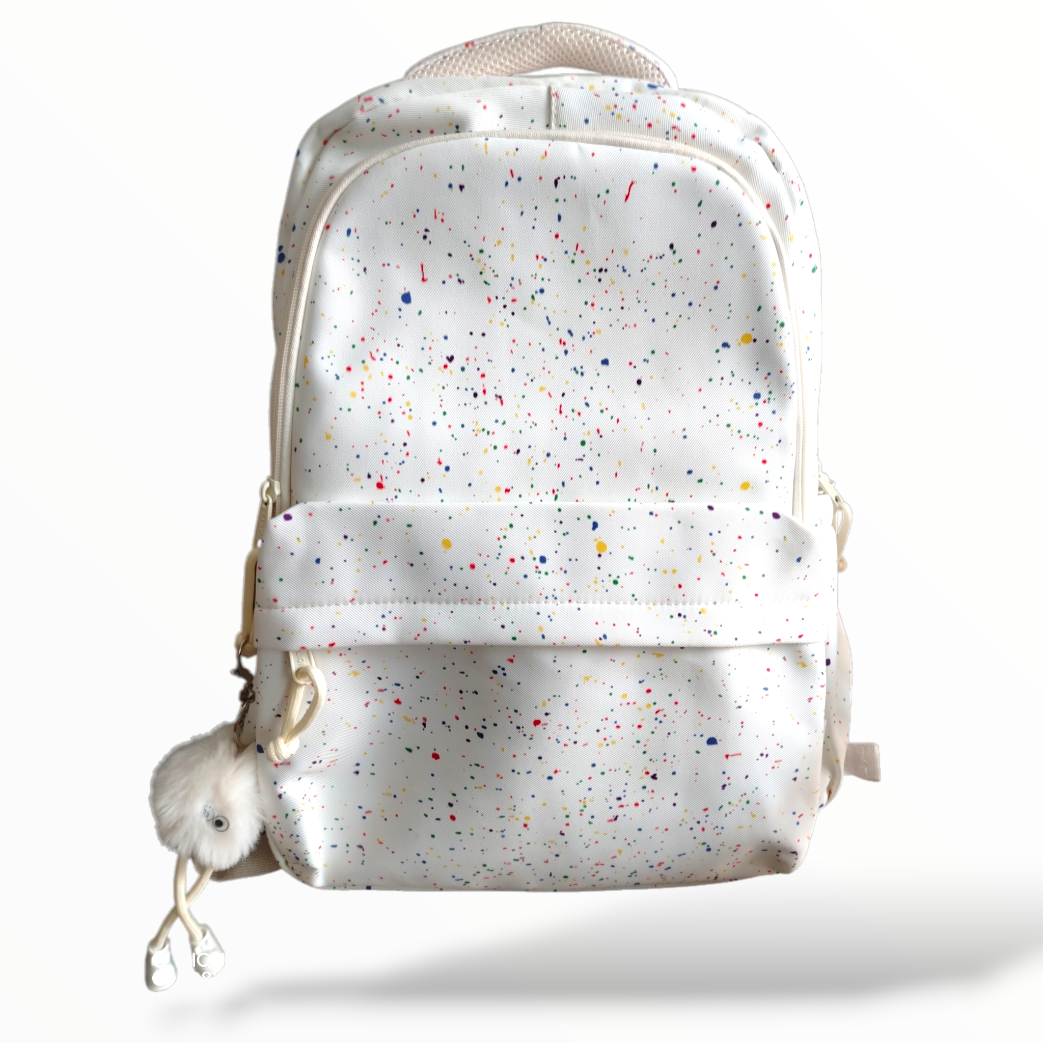 Mochila juvenil en color blanco cremoso con vibrante diseño de salpicaduras multicolor (paint splatter) en tonos rojo, azul, amarillo, verde y más.