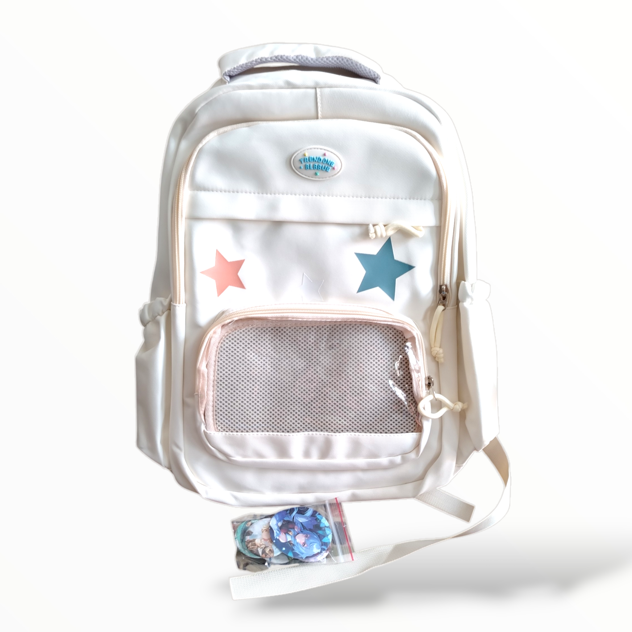 Diseño encantador con estrellas grandes en rosa pastel y azul turquesa, bolsillo frontal de malla transparente con cierre de cremallera, detalles en cordones y hebillas decorativas.
