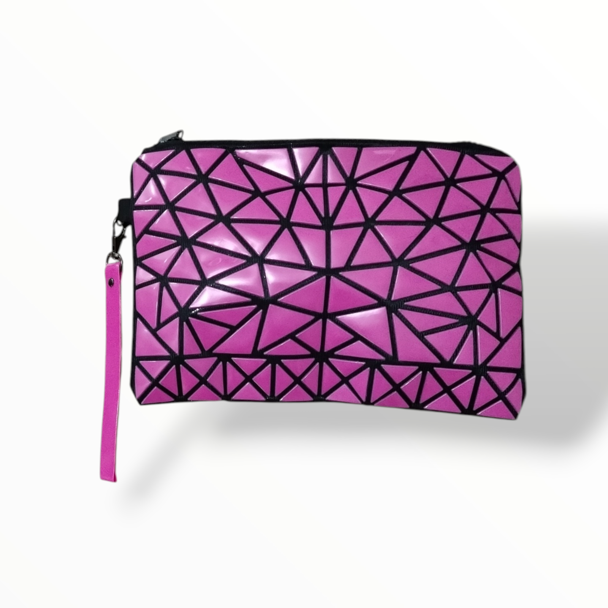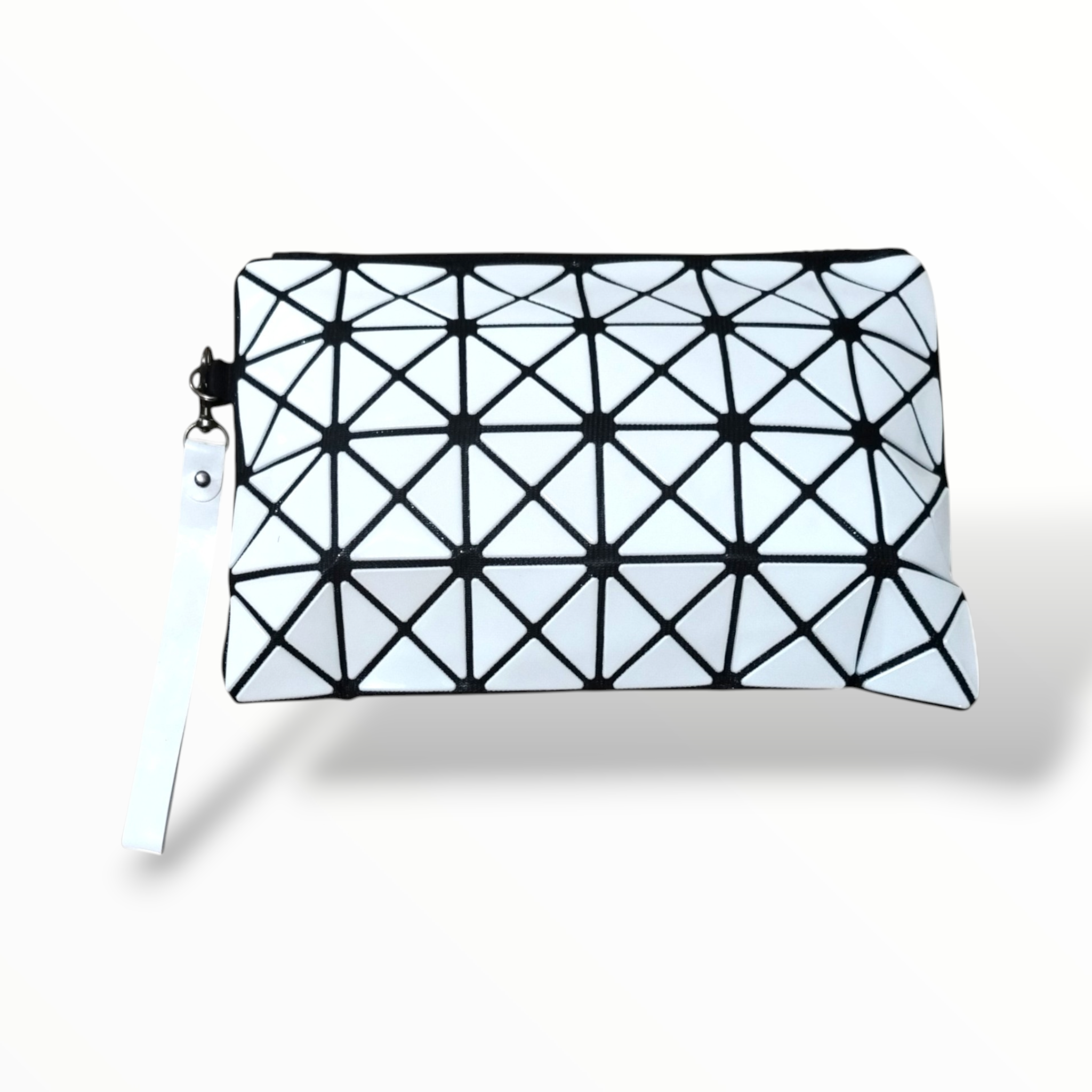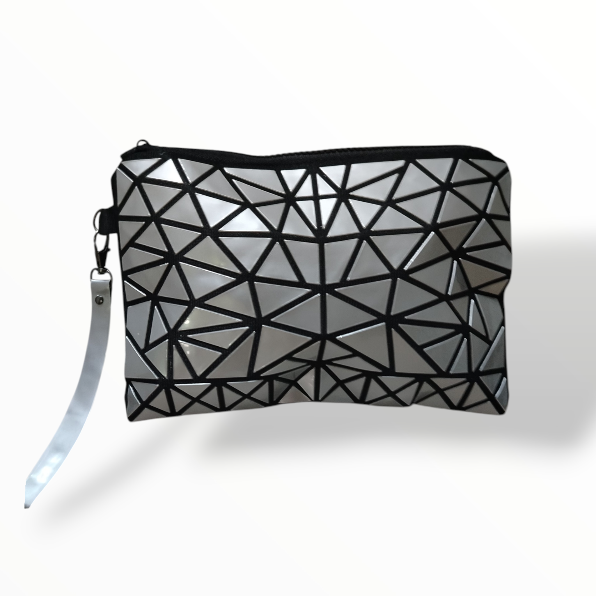 Este accesorio destaca por su vanguardista diseño geométrico tridimensional, compuesto por paneles triangulares que crean un efecto visual dinámico y moderno. Su estructura flexible permite que el neceser se adapte al contenido, ofreciendo versatilidad y un estilo arquitectónico único.